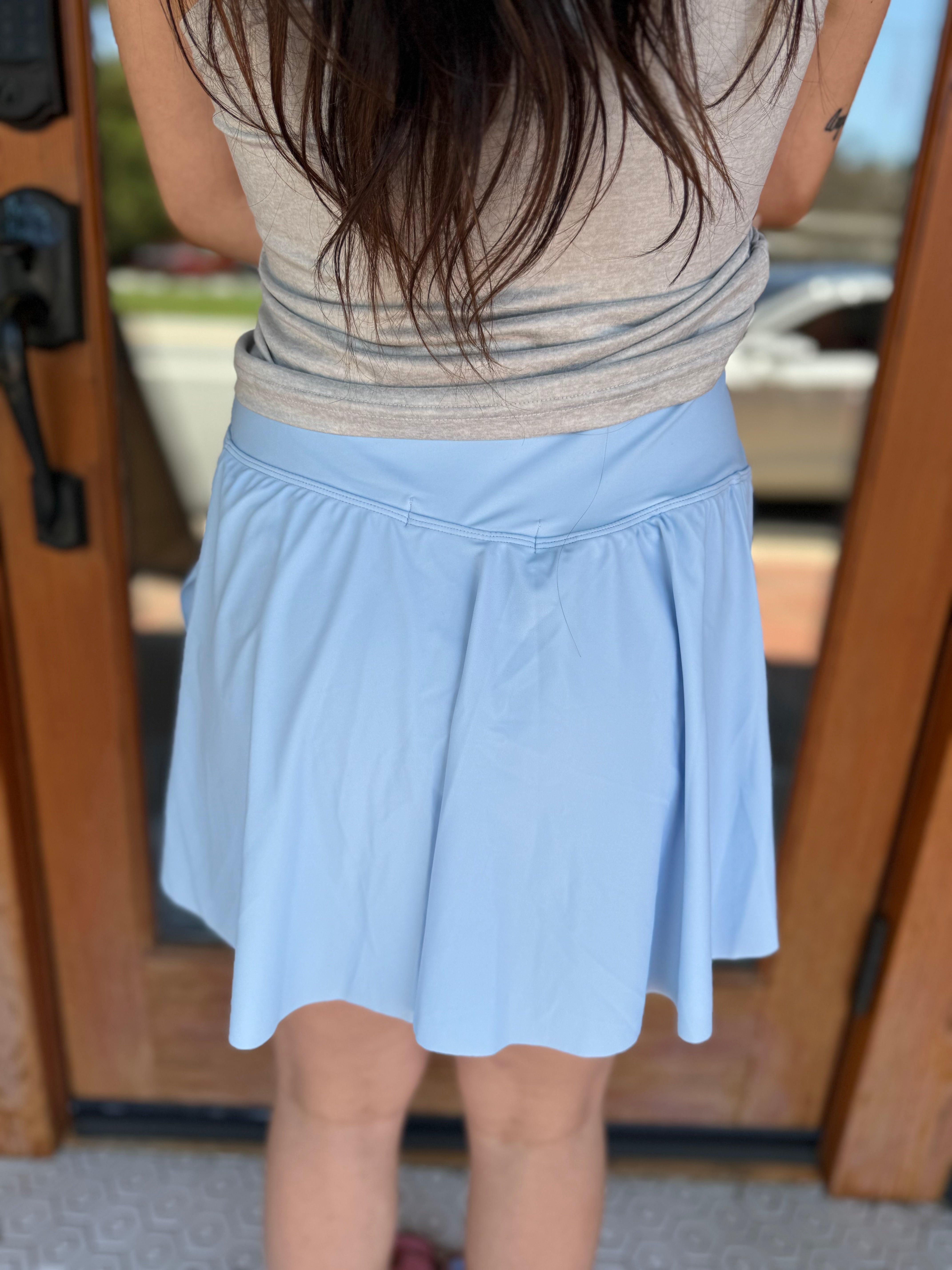 Maximize your workout with our Misses It's All In the Skort. Our sky blue athletic skort not only looks great, but also provides functionality with its pockets on the lining. Stay organized and stylish while you exercise.