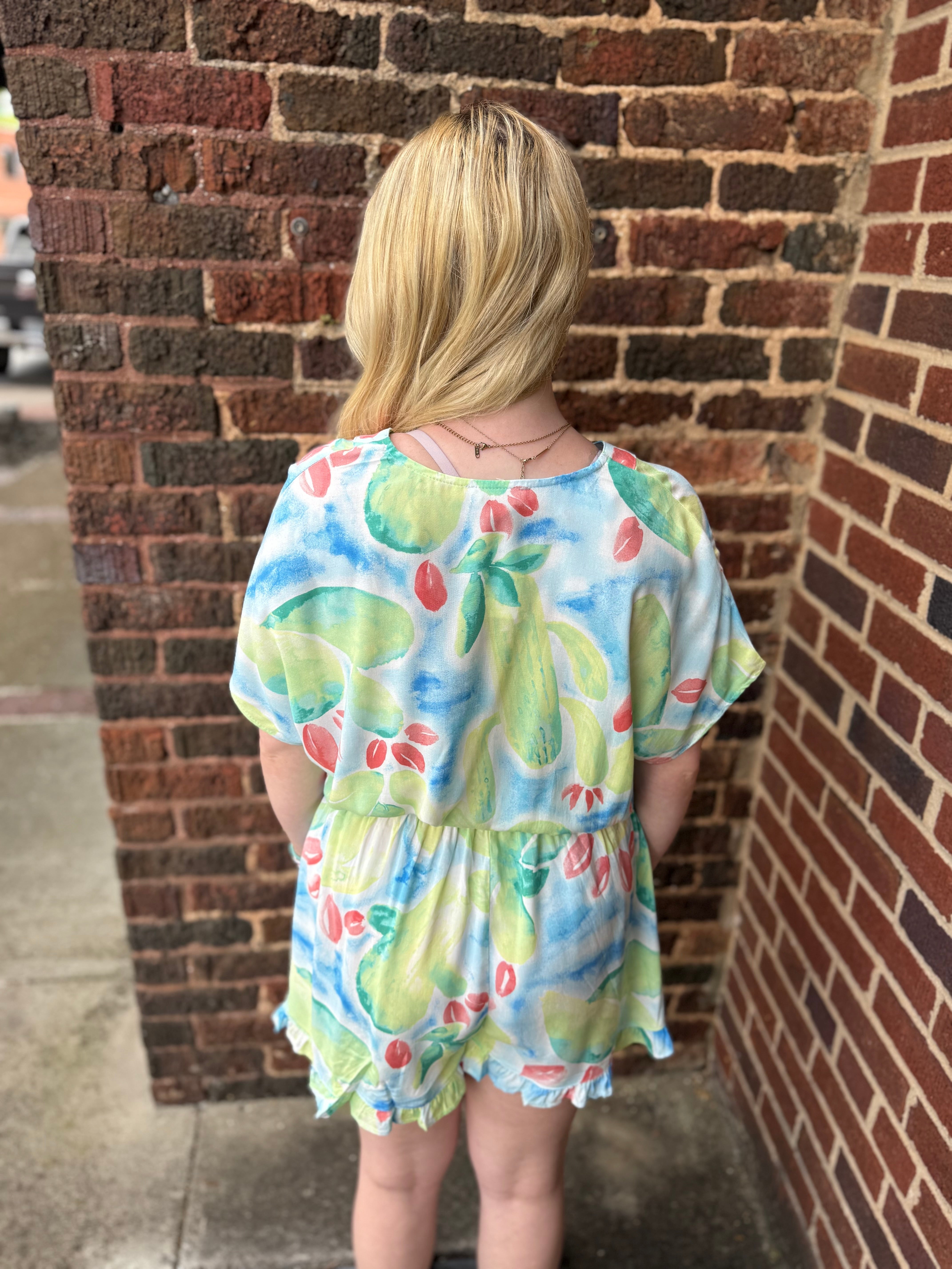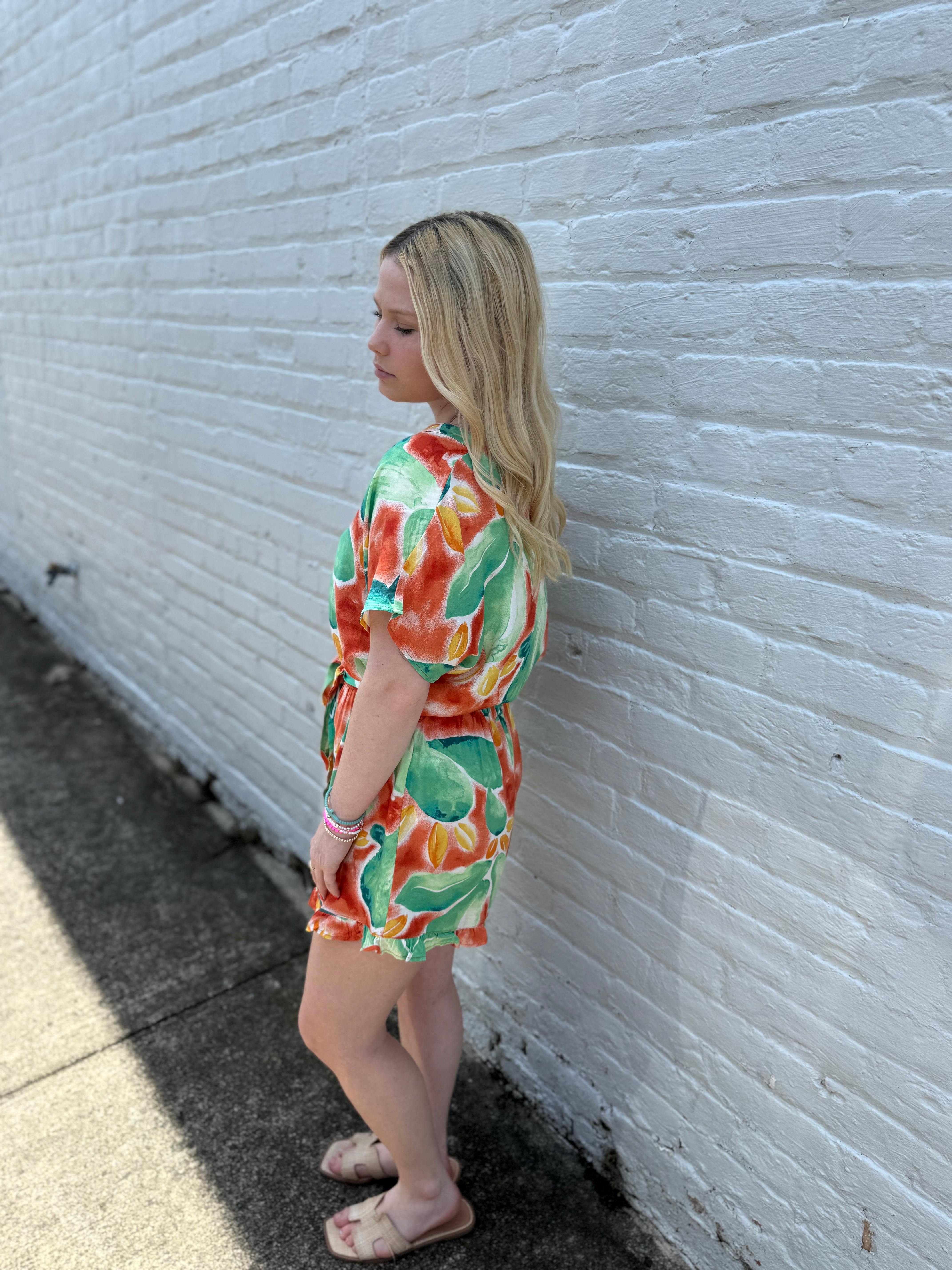 This Misses Bold Bloom Romper is a stylish choice for any occasion. Featuring functional buttons and a tie waist, it offers both comfort and versatility. The abstract floral watercolor pattern adds a touch of unique elegance. Available in two vibrant color combinations, blue/green and green/orange.