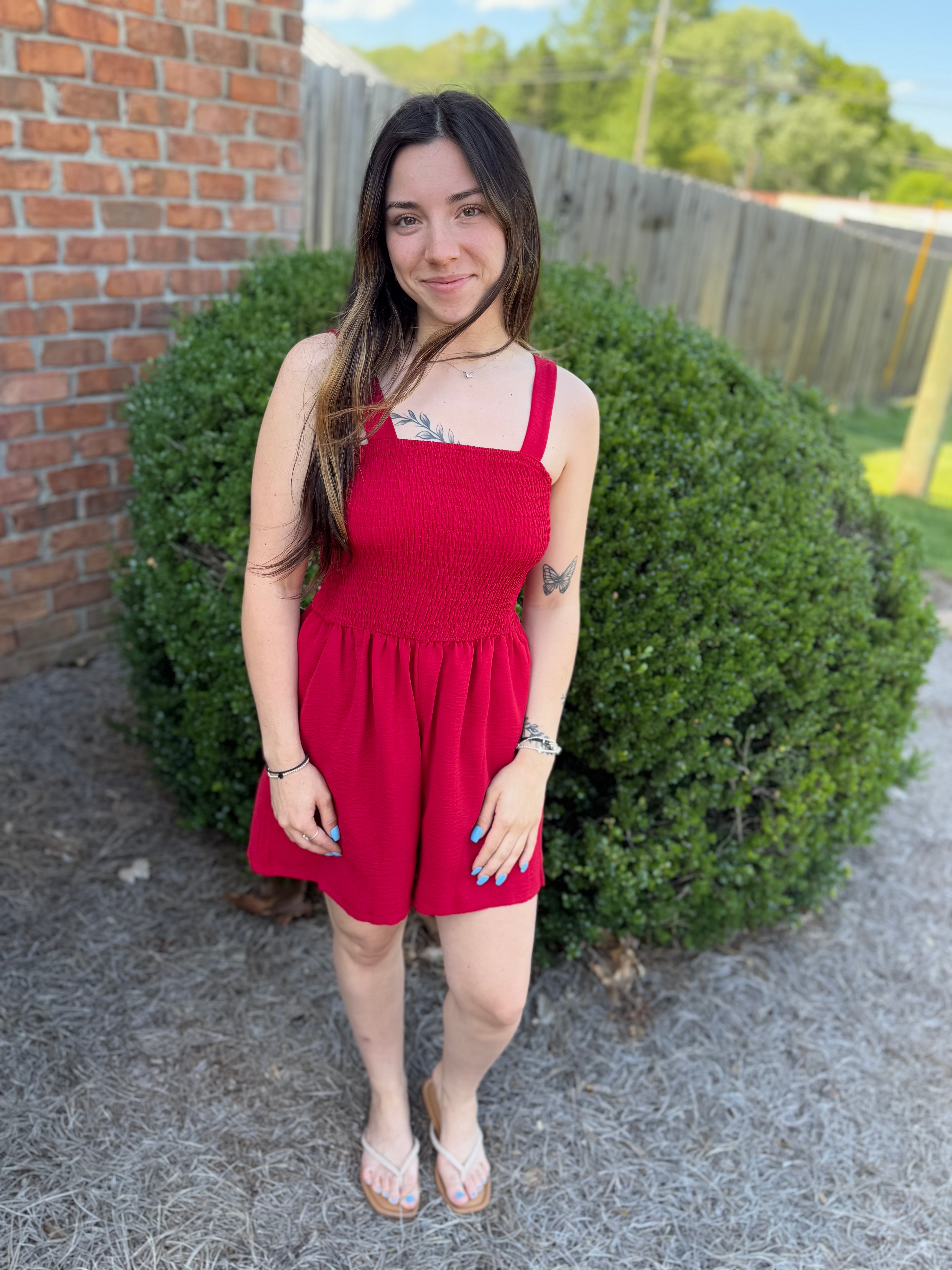 The Misses Wine Down Romper is a must-have addition to your wardrobe. This red romper features a smocked bust, providing a comfortable and flattering fit. Perfect for a night out with friends or a casual day out, this romper is sure to turn heads. Don't miss out on this stylish and versatile piece.