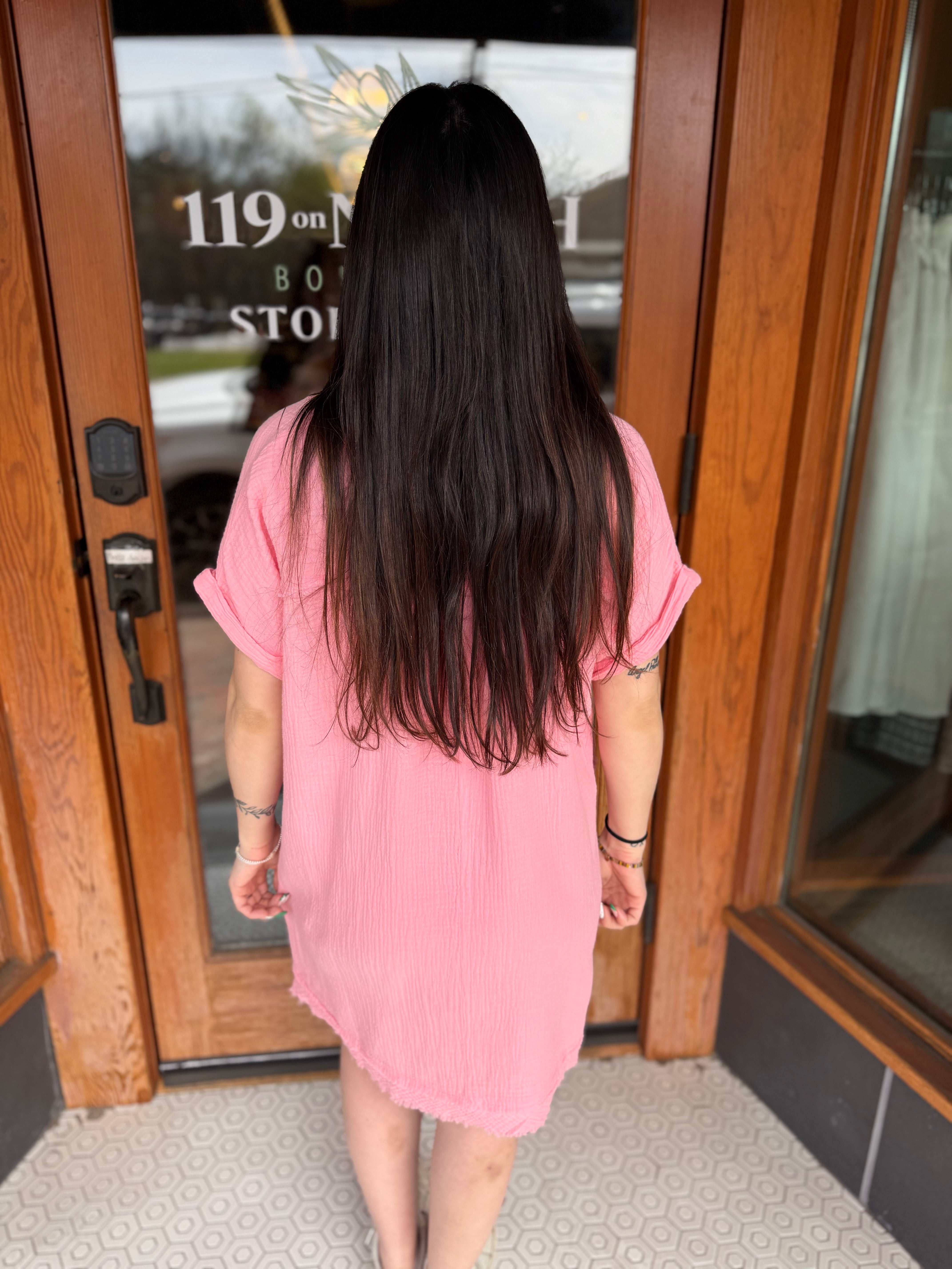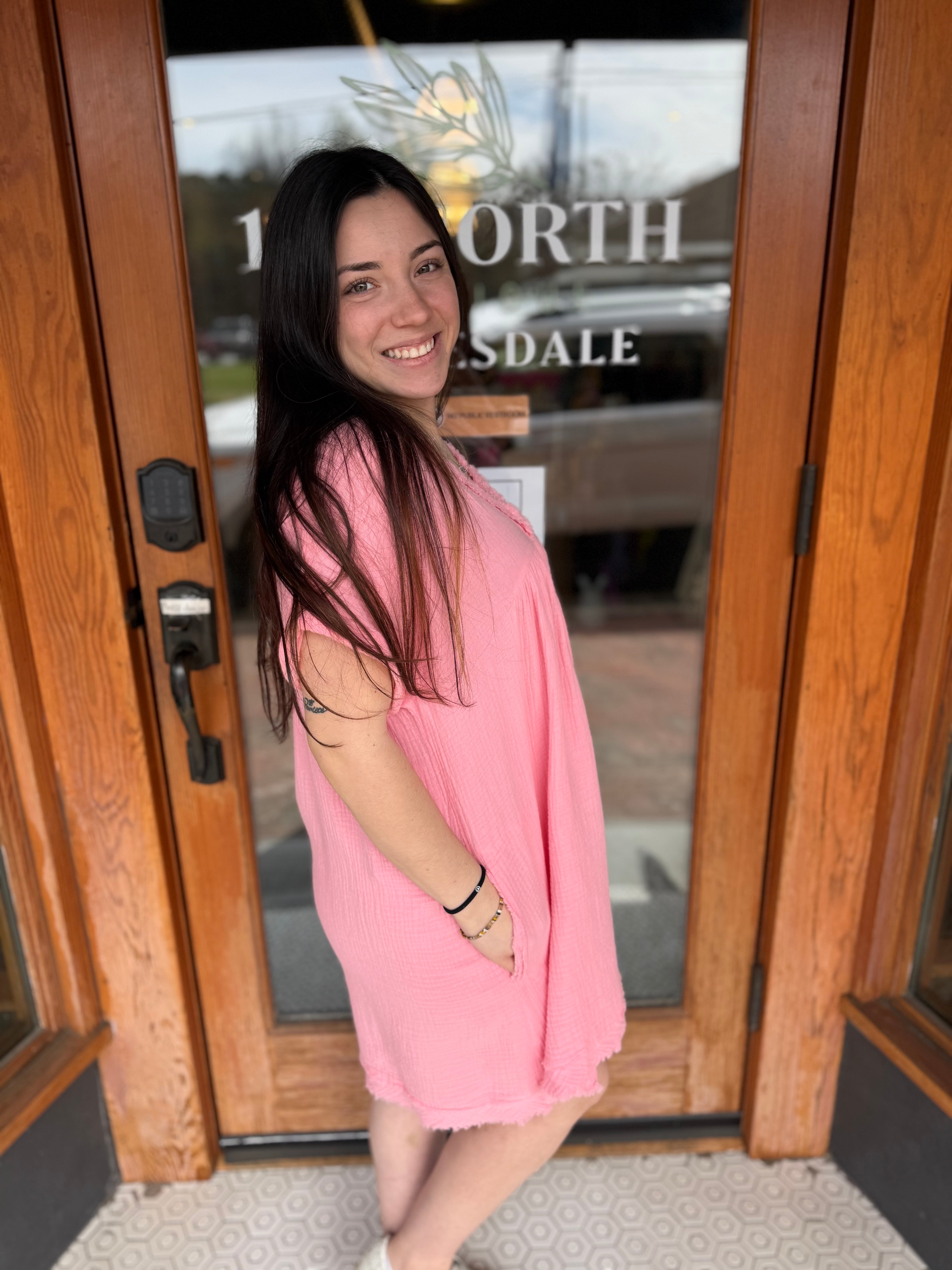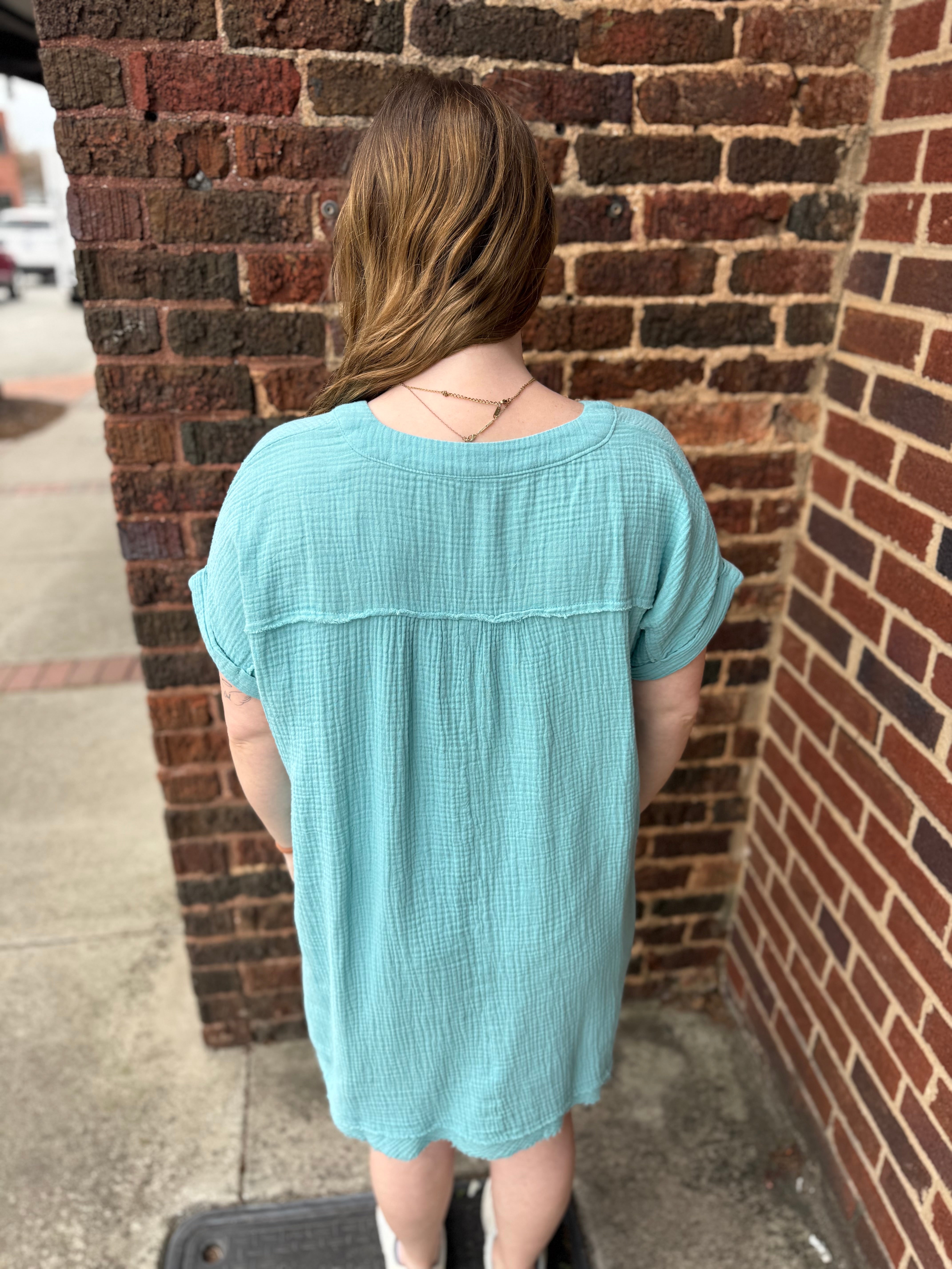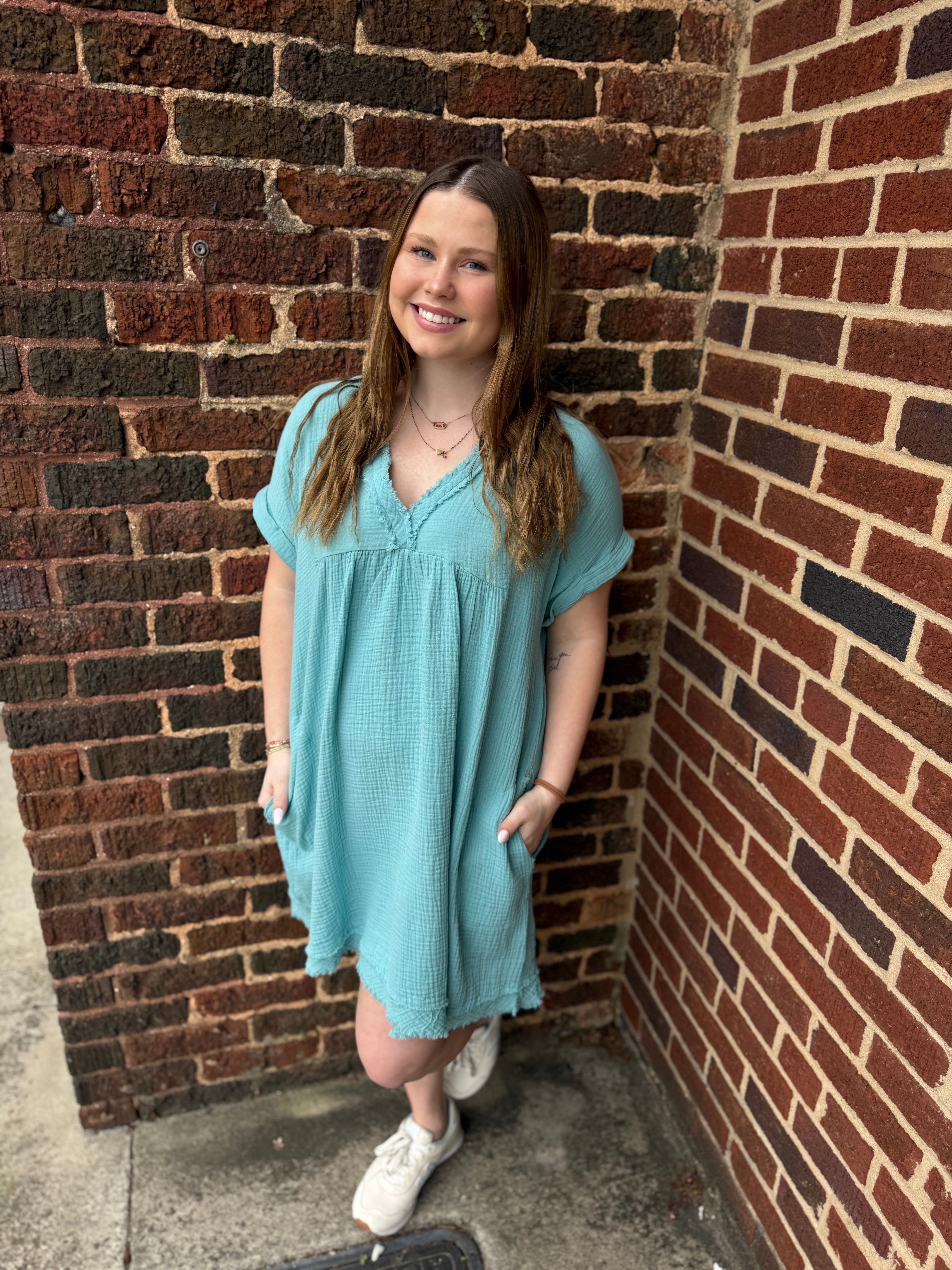 Meet the dress that feels like a second skin. Crafted in double gauze fabric, this short sleeve V-neck dress has a beautifully relaxed drape and raw edge finishing that gives it an effortlessly undone, editorial feel. The kind of dress you throw on and instantly feel good in.