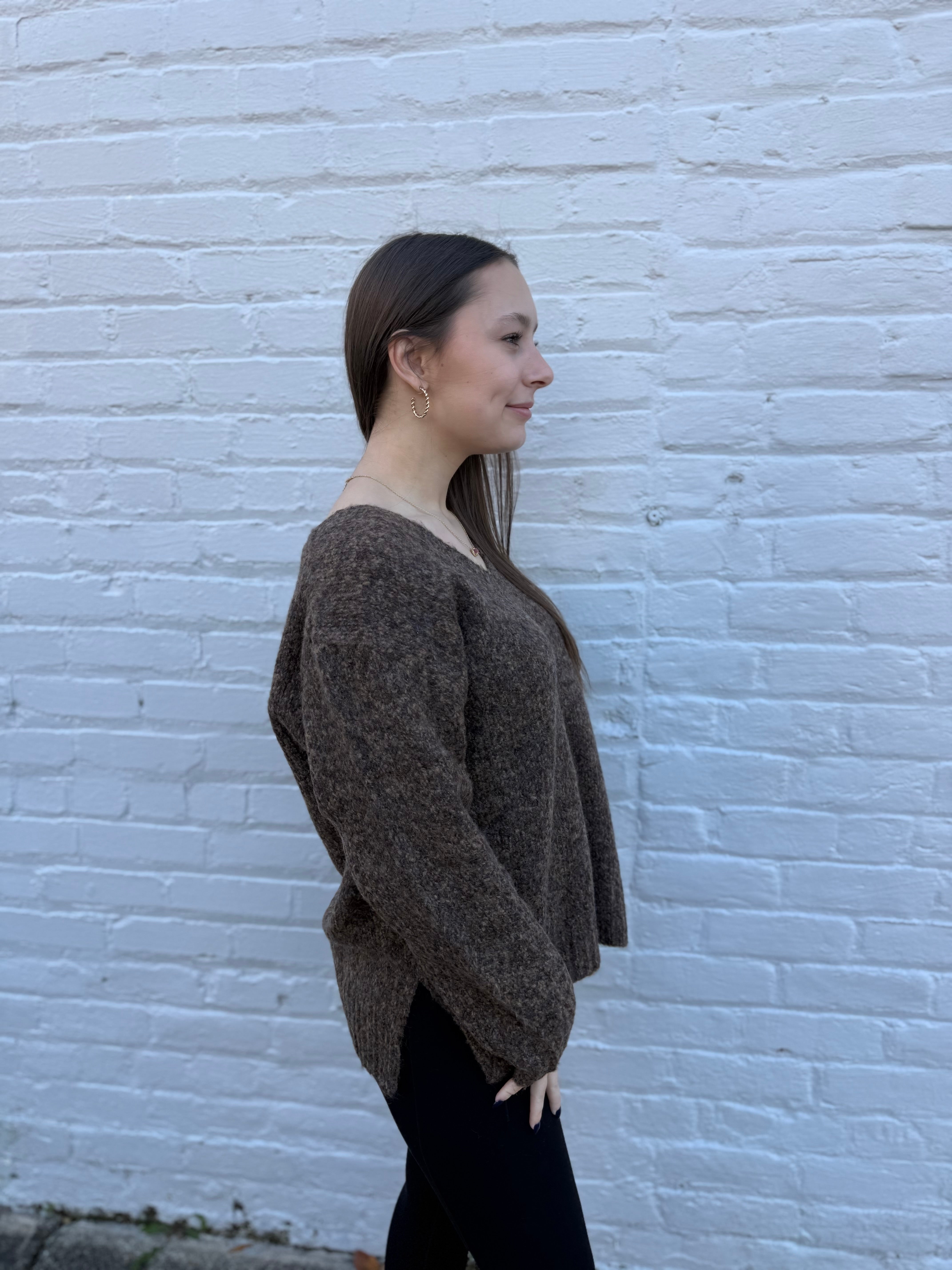 Wrap yourself in cozy comfort with this chocolate-hued V-neck sweater—your new bonfire essential. Perfect for crisp evenings spent sipping hot chocolate and enjoying good company, this piece layers beautifully over your favorite tee or stands alone as a warm, inviting staple. The soft fabric and flattering neckline make it as versatile as it is comfortable, whether you're gathered around a fire or curled up indoors. Embrace the season in style.