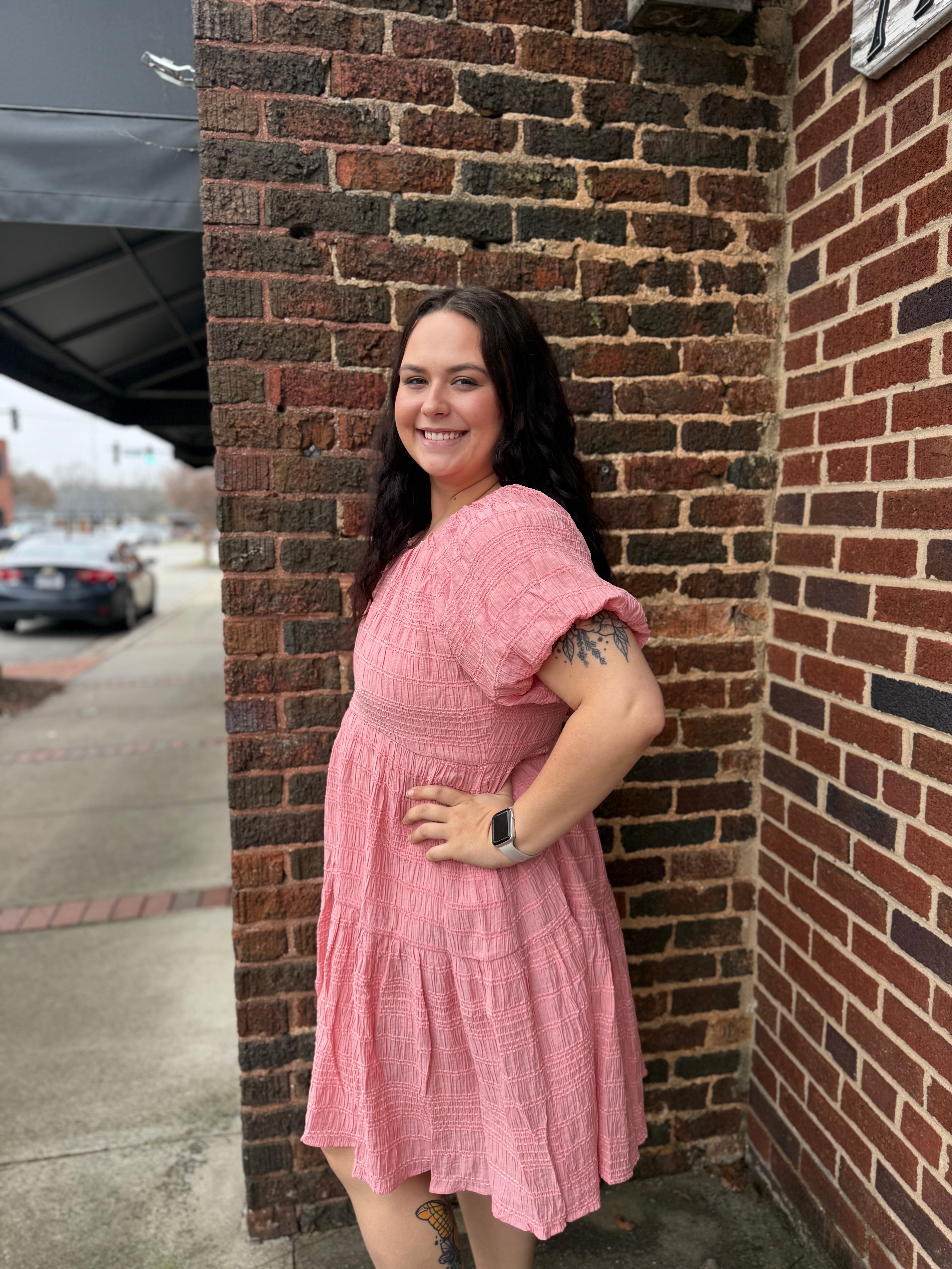 The loose, flowing silhouette drapes beautifully across the body, offering freedom of movement and all-day comfort without sacrificing style. Rich texture adds depth and visual interest to the fabric, creating dimension that catches the light with every turn. But the true showstopper? A series of delicate bow tie closures cascading down the back, transforming a simple dress into a statement piece that's as beautiful coming as it is going.