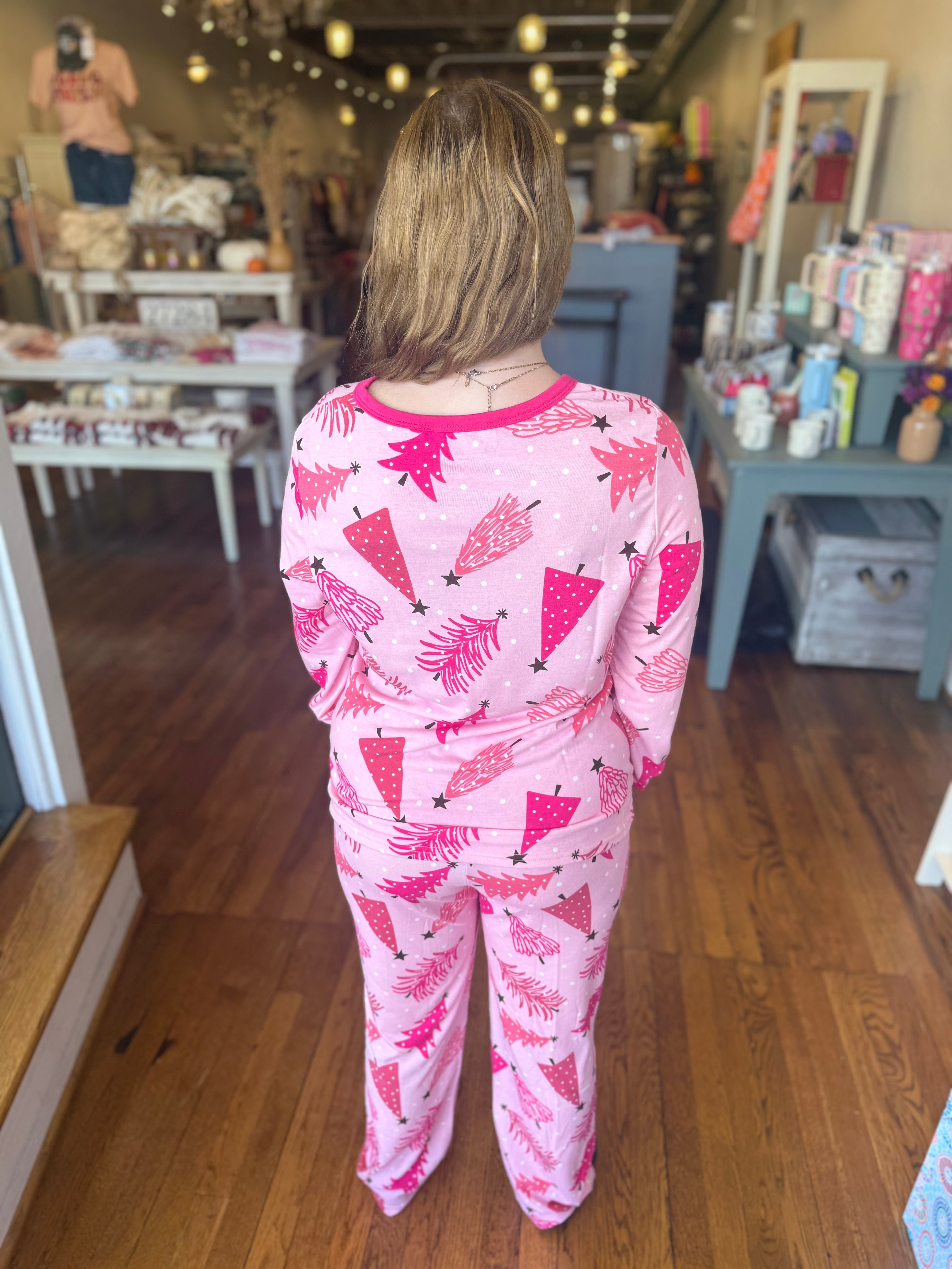 Celebrate the cozy spirit of the season in this pink lounge set featuring a festive Christmas tree print. The long-sleeve pullover pairs perfectly with comfy matching pants, making it an ideal choice for holiday mornings or cozy nights by the fire. Soft and playful, this set blends comfort with a dash of holiday cheer.