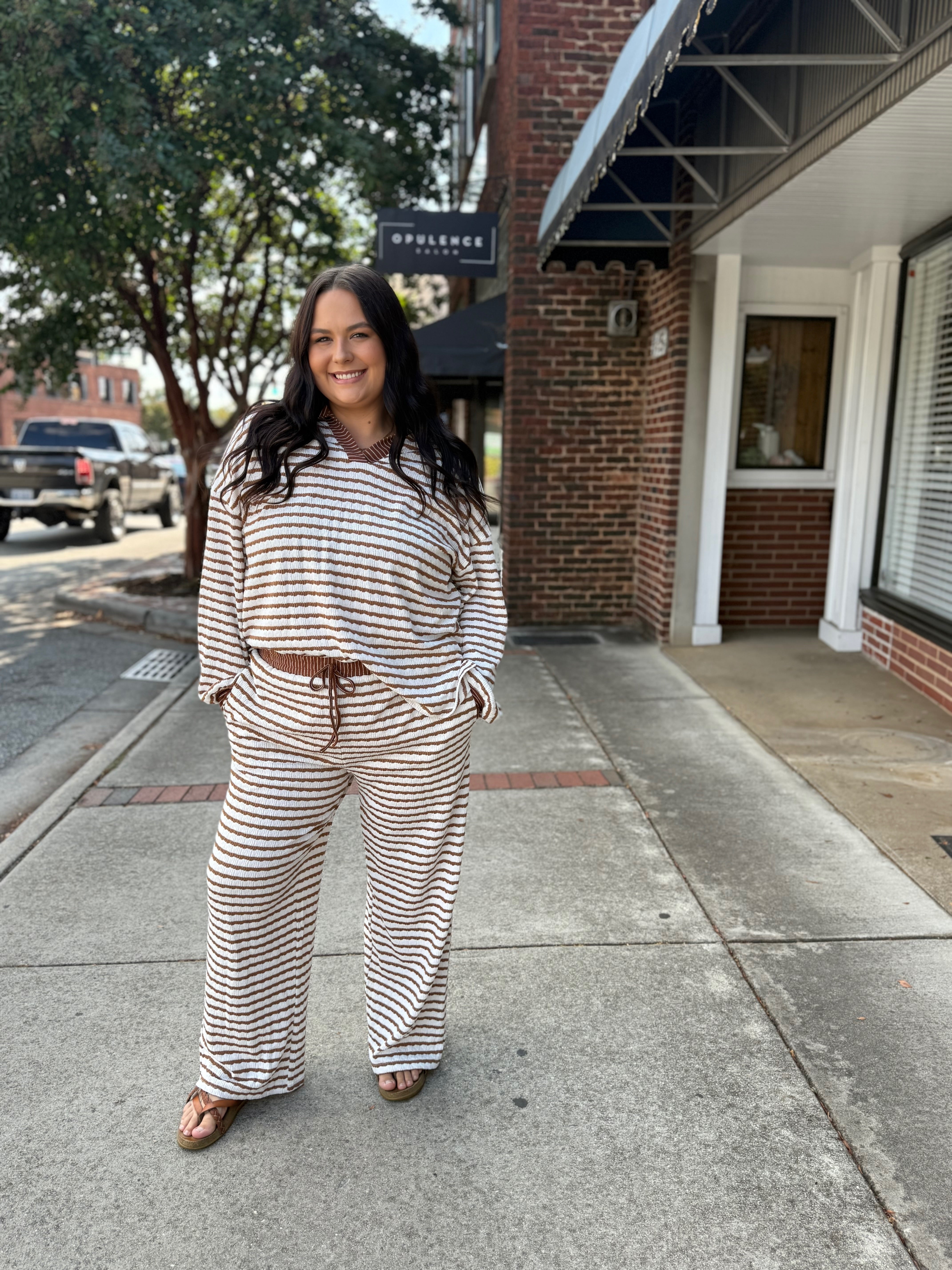 Crafted from a soft and stretchy material, this Misses Desert Lounge Set is the perfect combination of comfort and style. With a trendy brown and white striped design, this two-piece set is perfect for lounging at home or running errands. Stay fashionable and comfortable with this must-have lounge set.