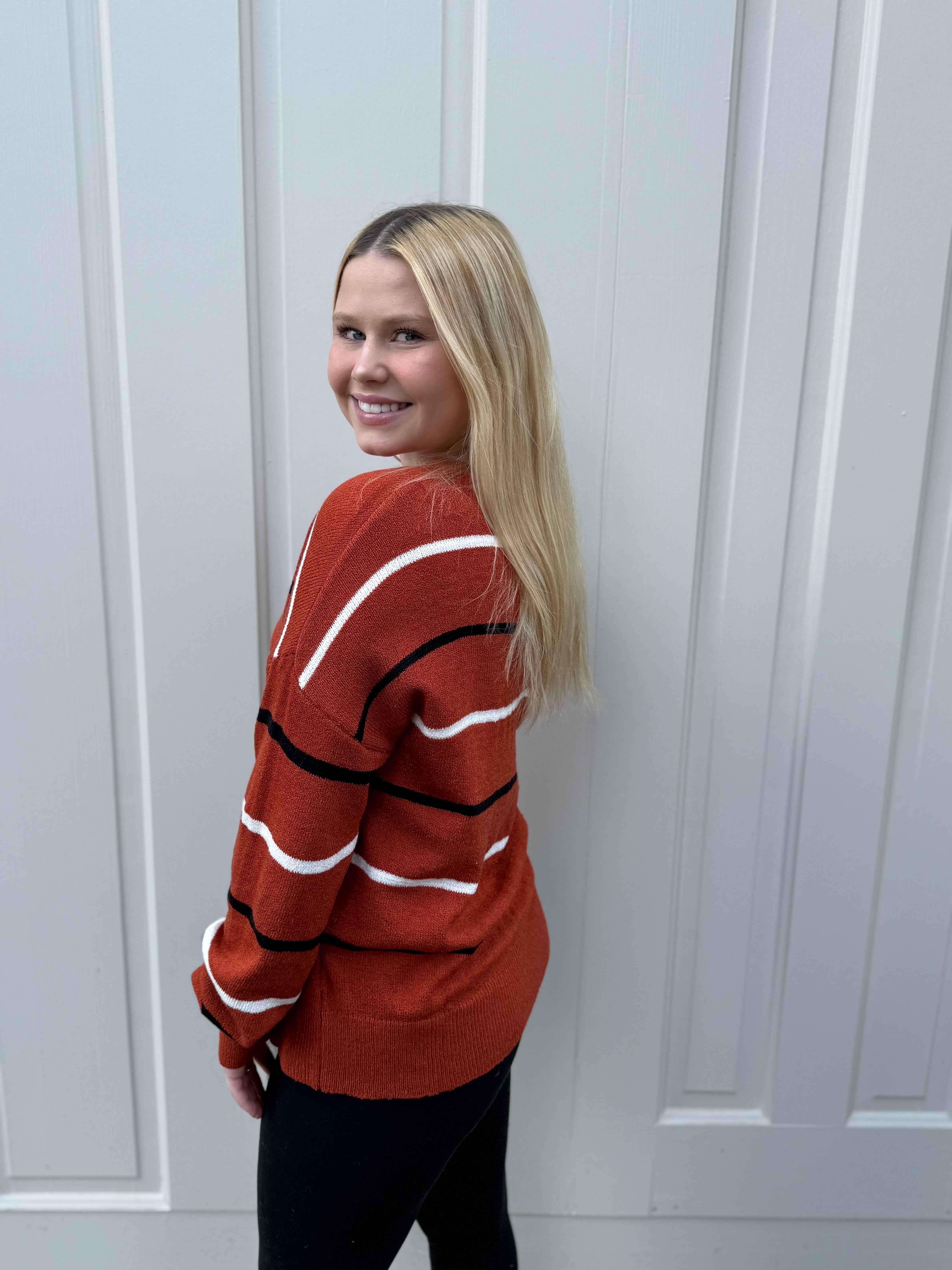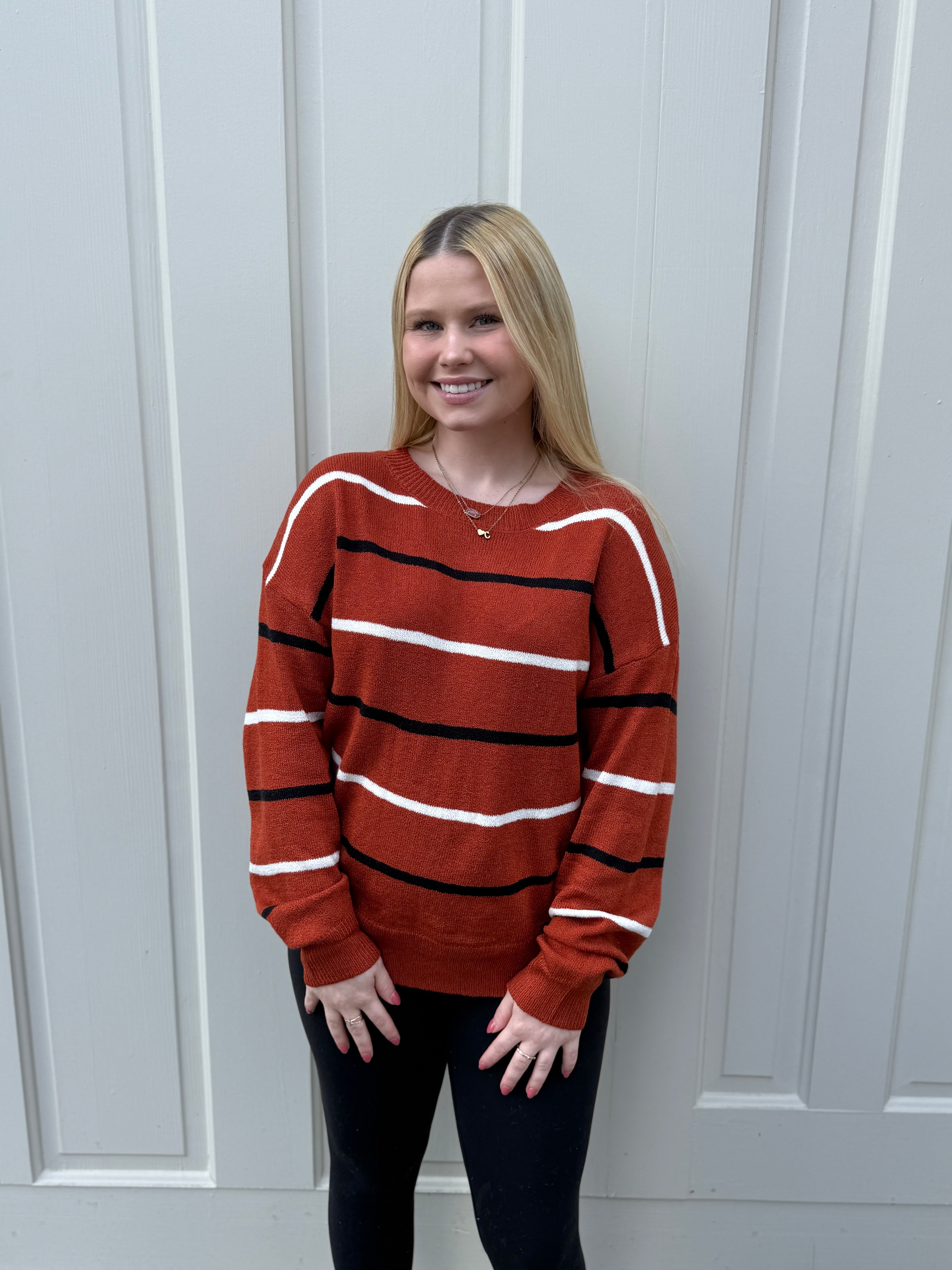 Spice up your wardrobe with our Misses Java Twist Sweater! This lightweight sweater boasts a burnt orange color with alternating black and white stripes, perfect for embracing those pumpkin spice and fall vibes. Stay cozy and stylish all season long with this addition to your closet.