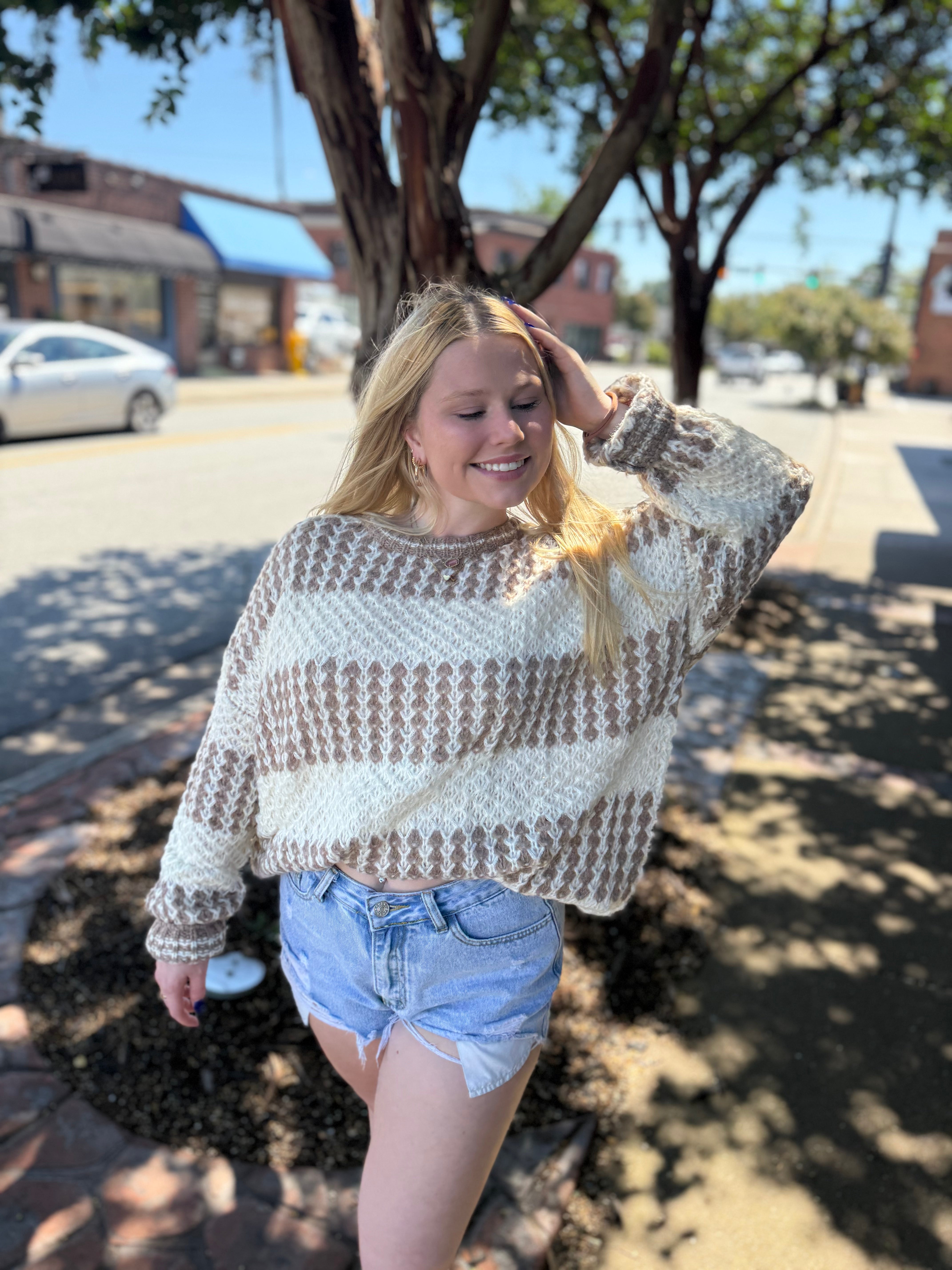 Cozy up in the Misses Latte Layers Sweater, featuring charming cream and light brown stripes that capture the essence of fall. This playful sweater is just right for cool autumn days, keeping you warm while adding a touch of fun to your wardrobe. Perfect for layering or wearing on its own, it's your new go-to for effortless seasonal style.