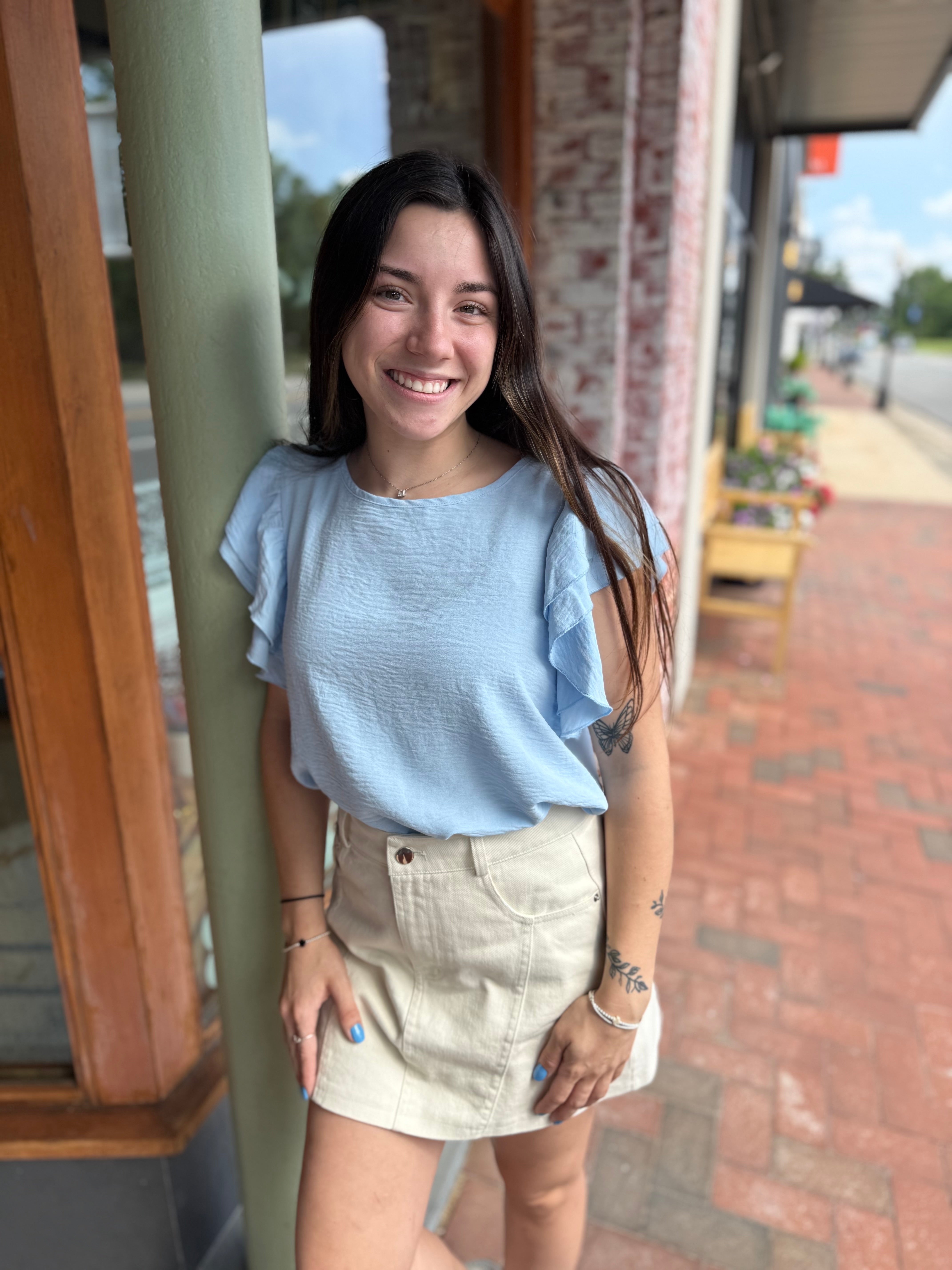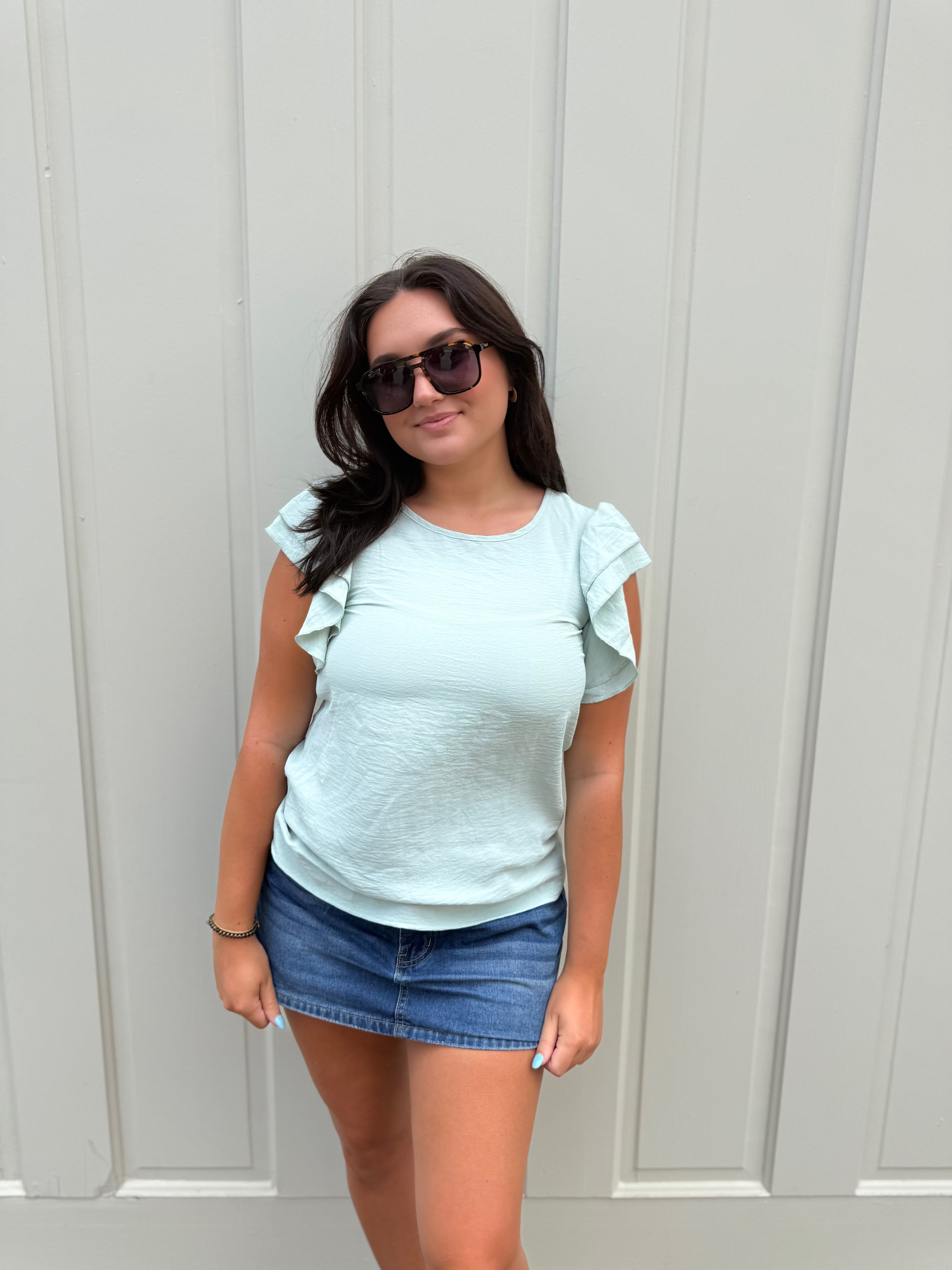 This lightweight top features charming ruffle sleeves that add a playful touch to any outfit. Perfect for layering or wearing on its own, it easily transitions from work to weekend. Pair it with a skirt for a polished office look or dress it down with jeans for a casual lunch with friends. Available in two versatile colors to brighten your wardrobe.