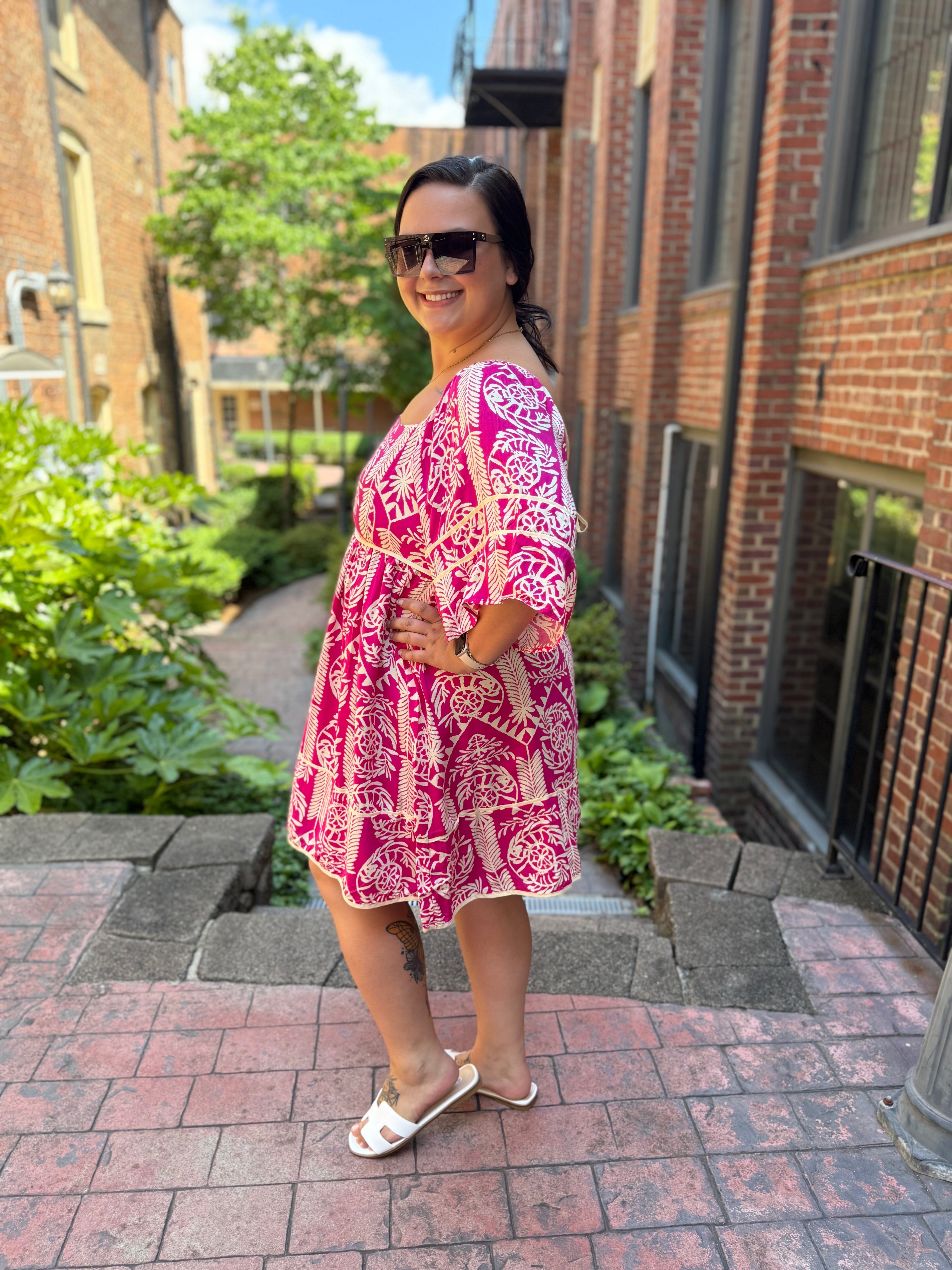 Discover the perfect combination of flirty and elegant with our Misses Strawberry Fields Dress. Its deep pink color and square neckline provide a bold yet charming look, while the intricate pattern adds a touch of sophistication. The tie feature on the upper back adds a playful touch to this mini babydoll dress. Elevate your style with this statement piece.
