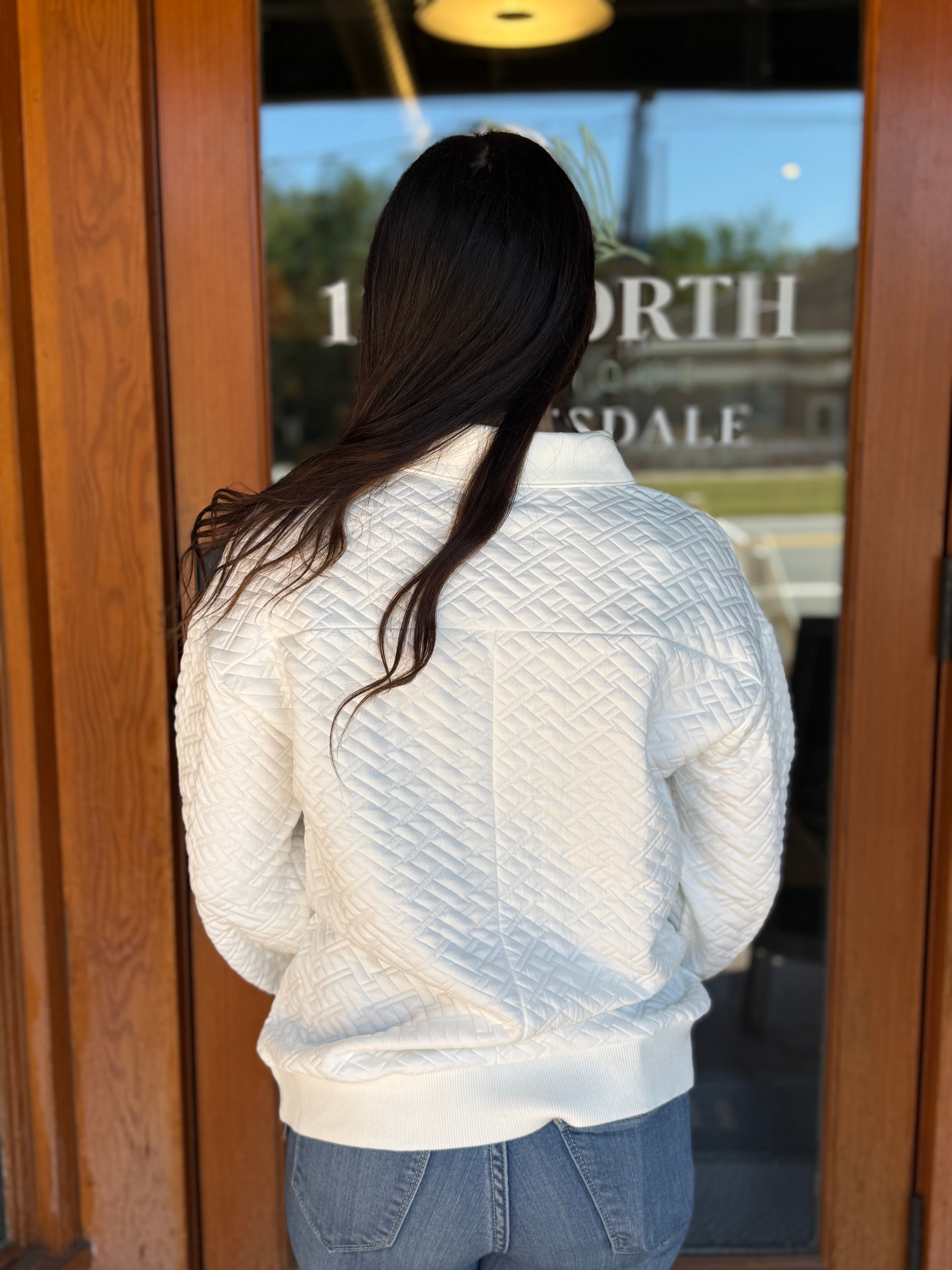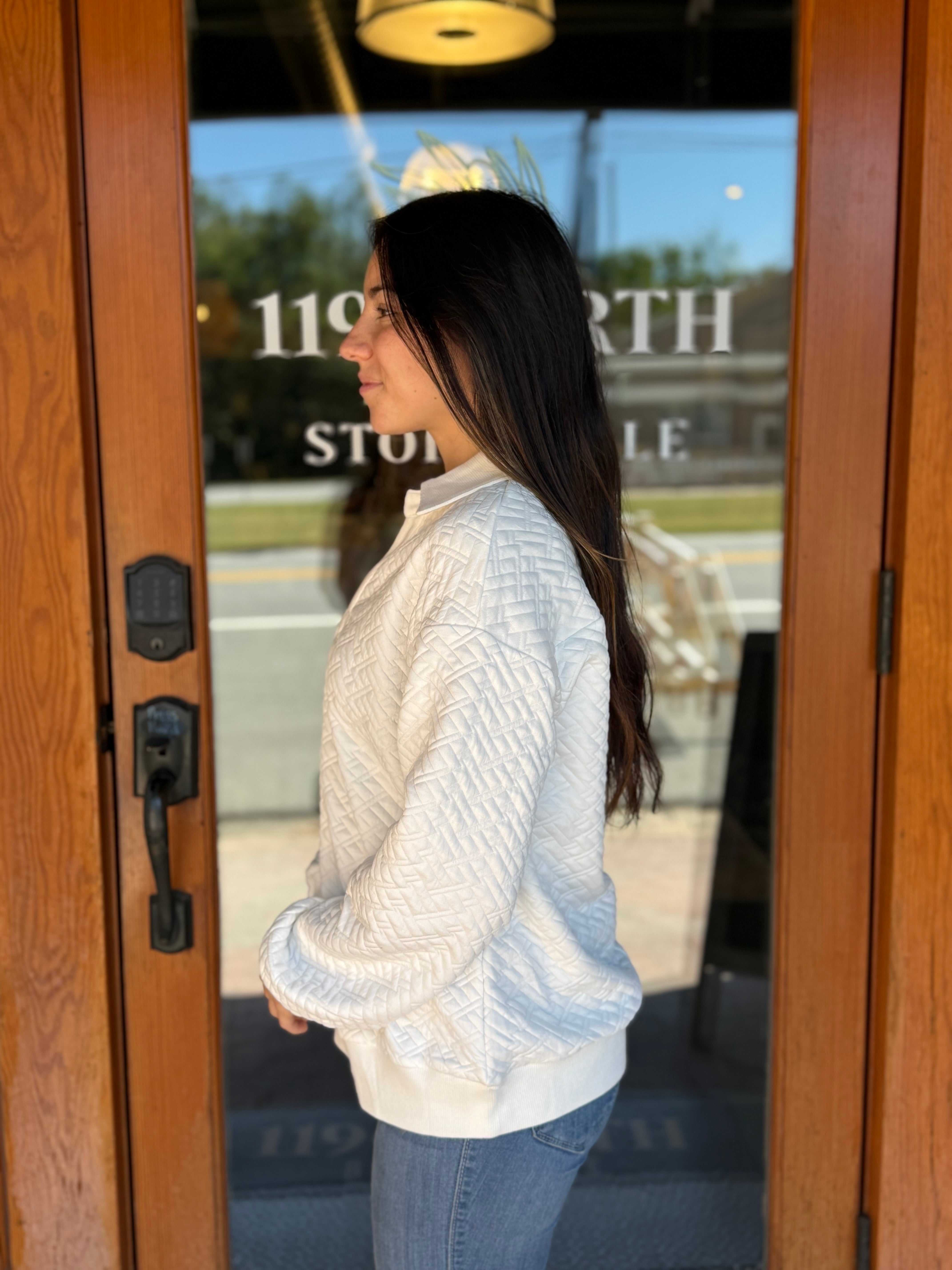 The Misses Textured V-Neck Sweatshirt is the perfect addition to your wardrobe. Made with a unique textured fabric and a classic v-neck collar, this white sweatshirt is versatile and can be layered or worn on its own. Stay comfortable and stylish with this must-have piece.