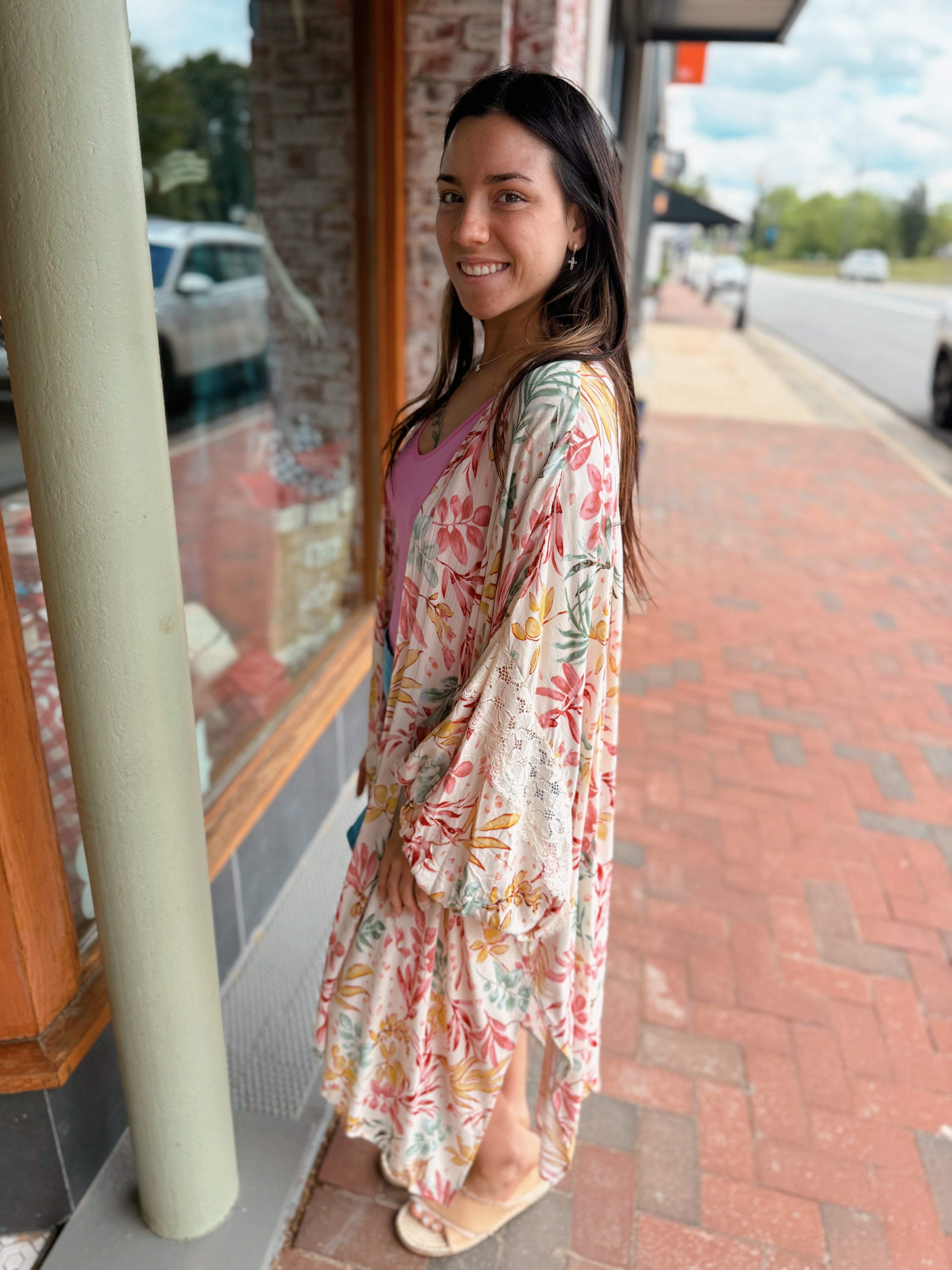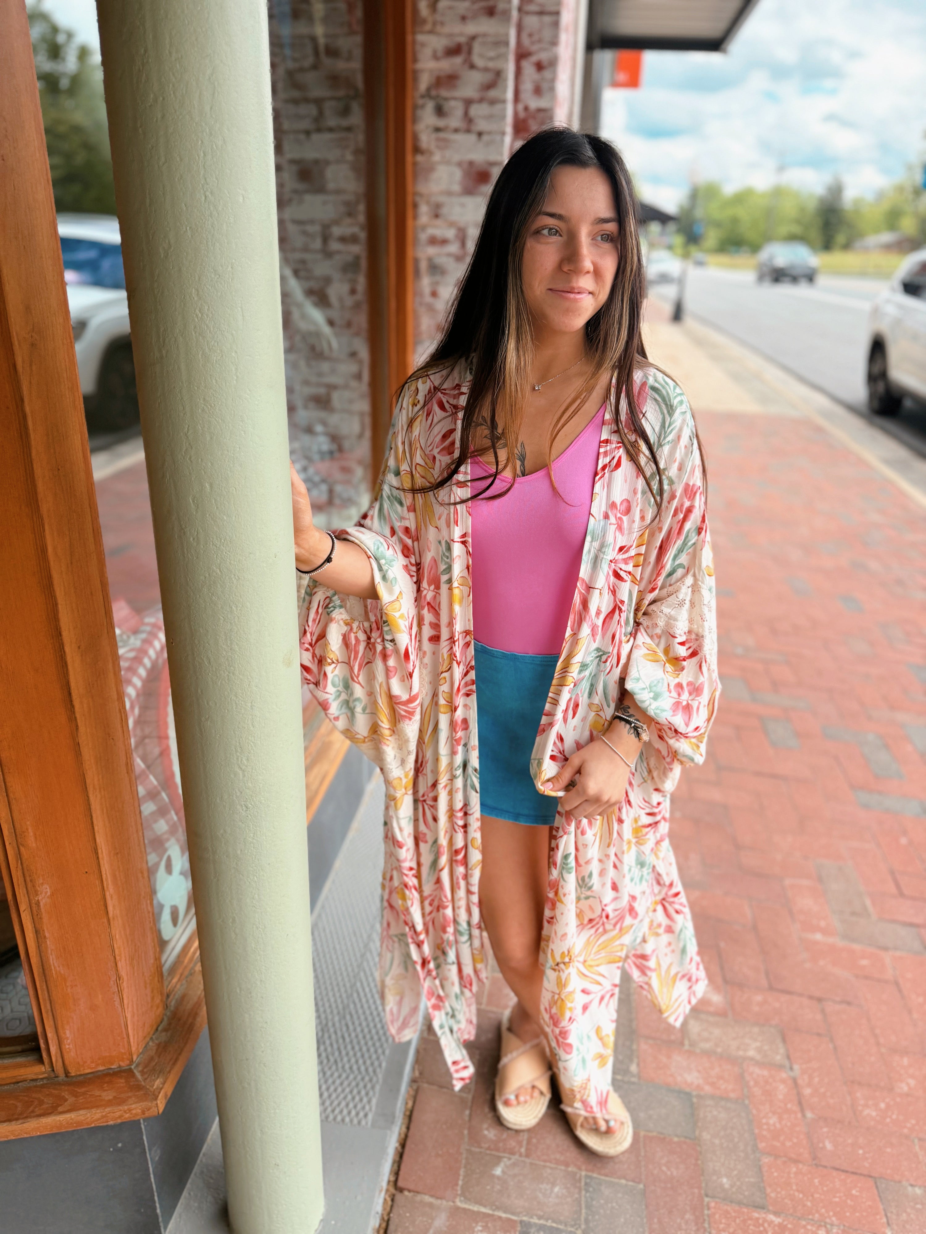 Unleash your playful side with our Misses Tropical Breeze Kimono! This bright and colorful kimono is perfect for a day at the beach as a coverup, or for a night out as a stylish layering piece. Don't miss out on this versatile and fun addition to your wardrobe!