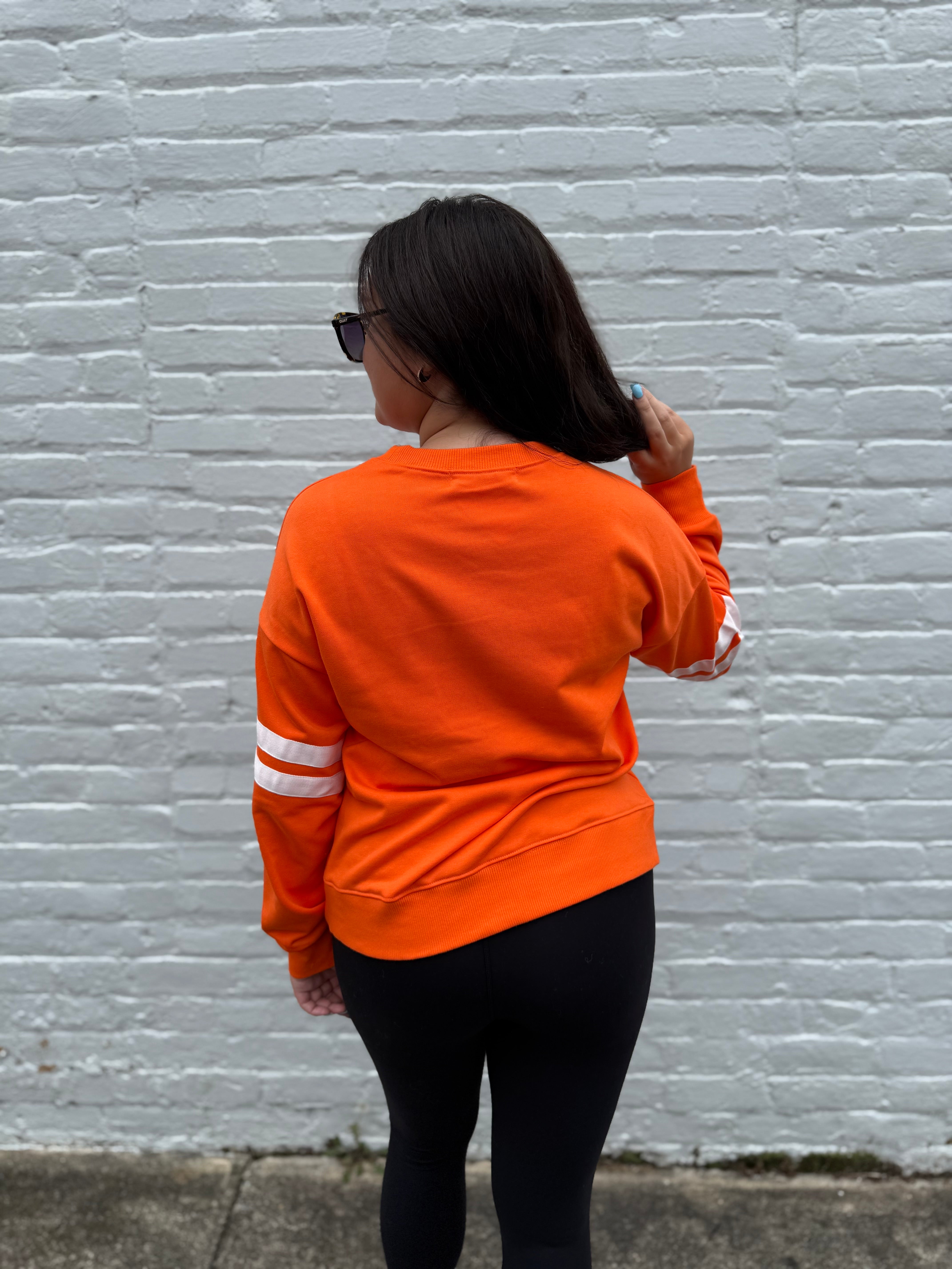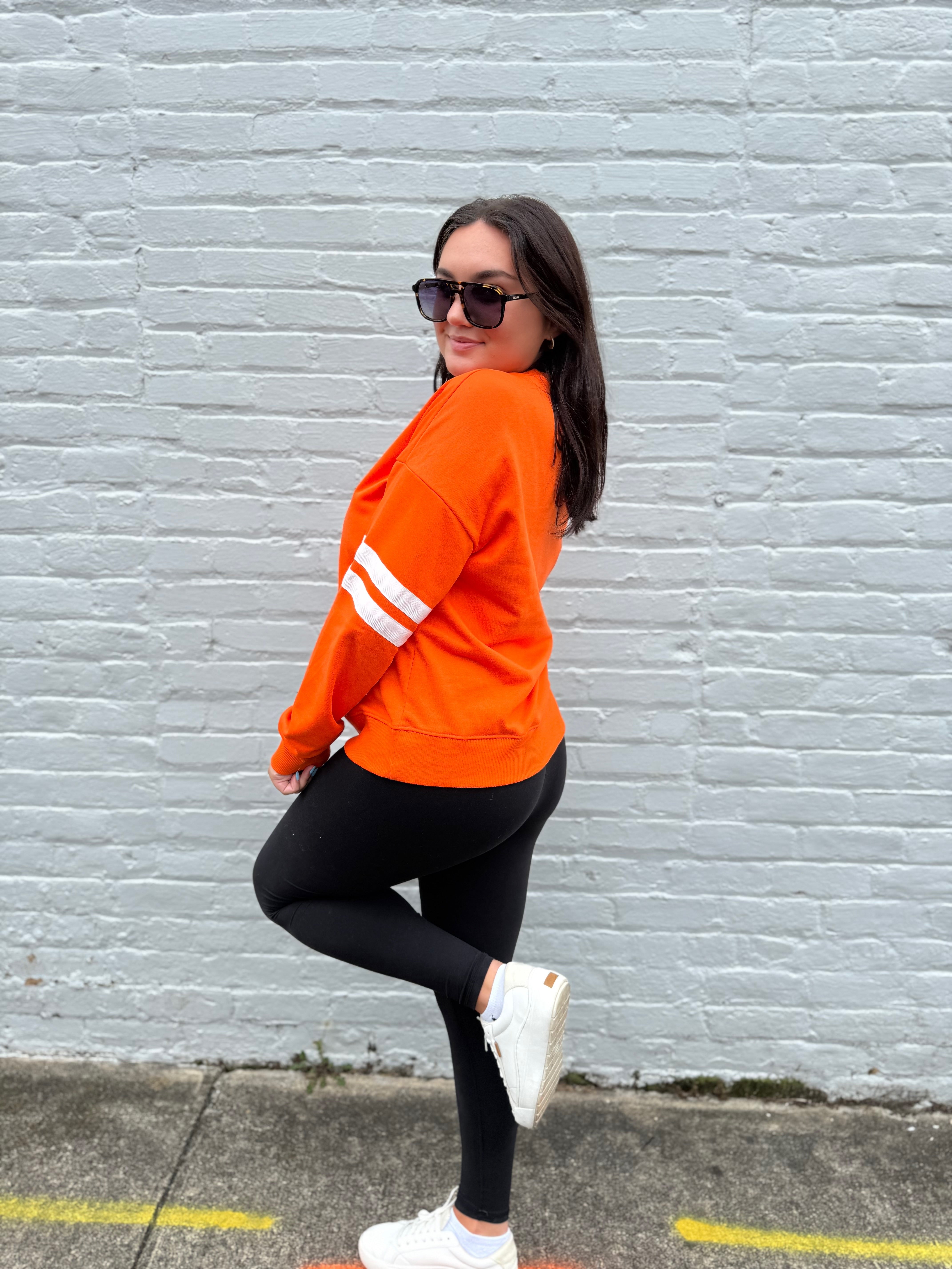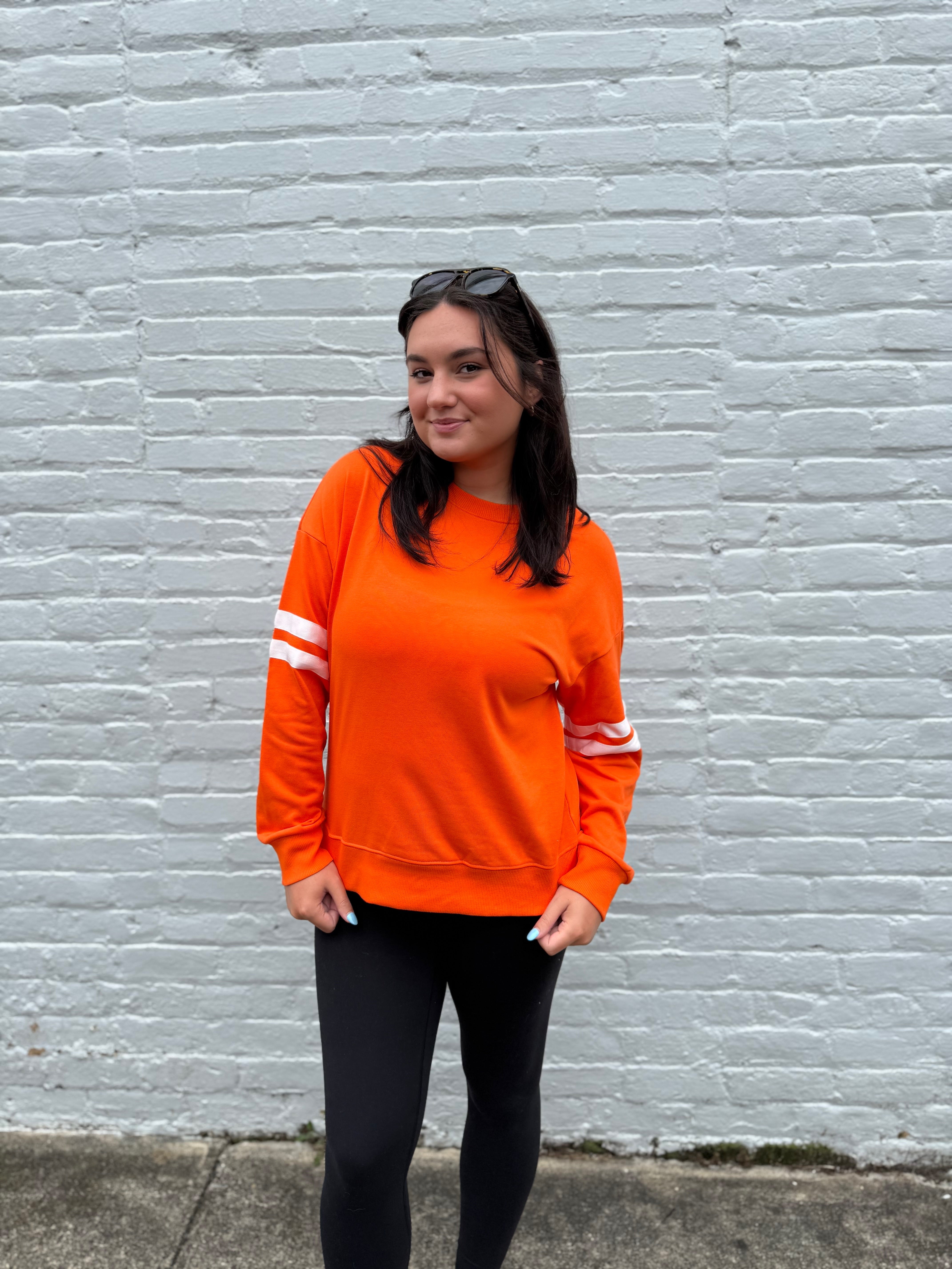 Get ready for game day or a festive fall outing with the Misses Varsity Stripe Top. Its vibrant orange color ensures you stand out whether you're cheering at the football game, exploring the pumpkin patch, or wandering a haunted trail. Cozy and playful, this top adds a fun touch to your seasonal adventures.