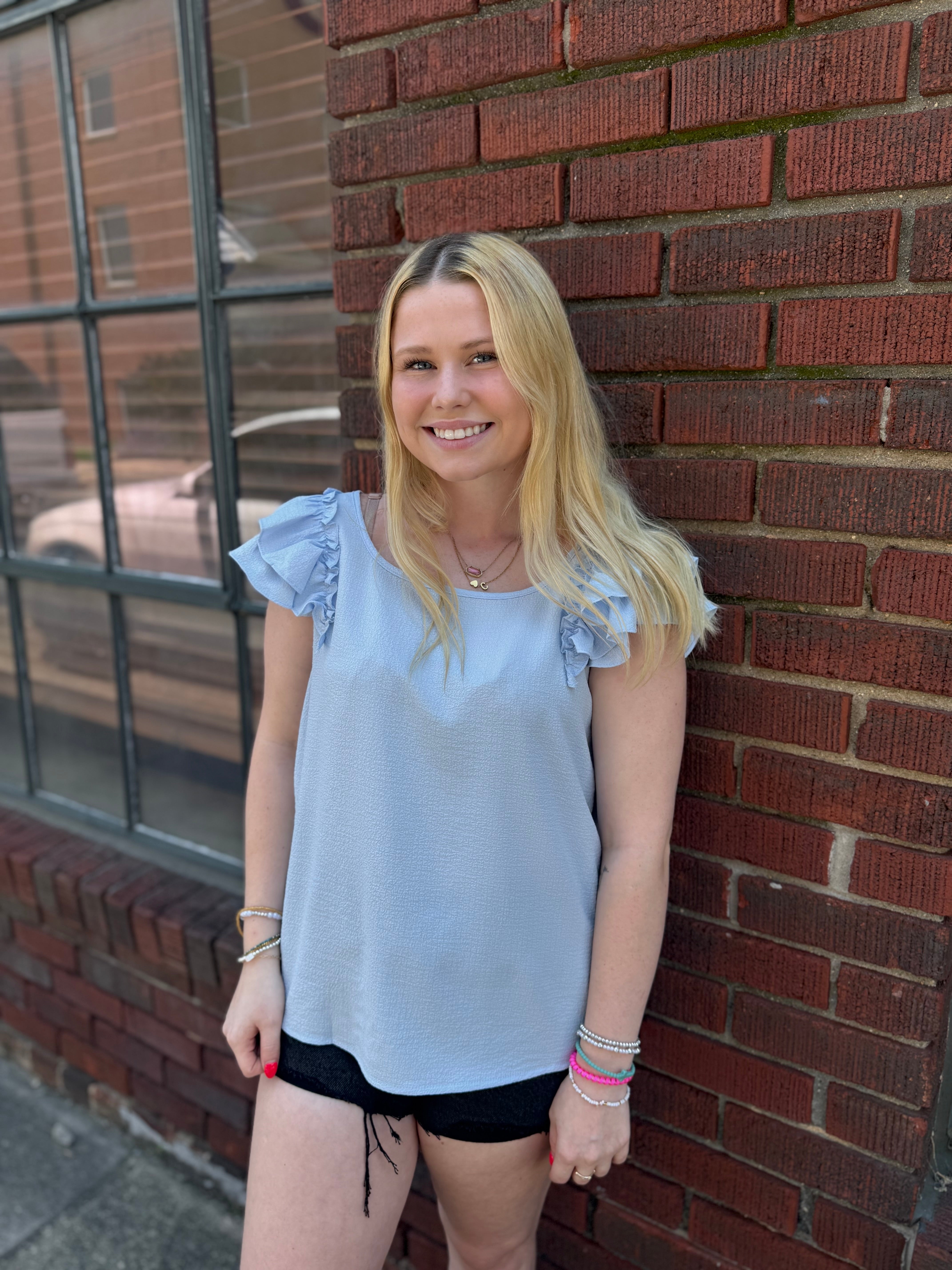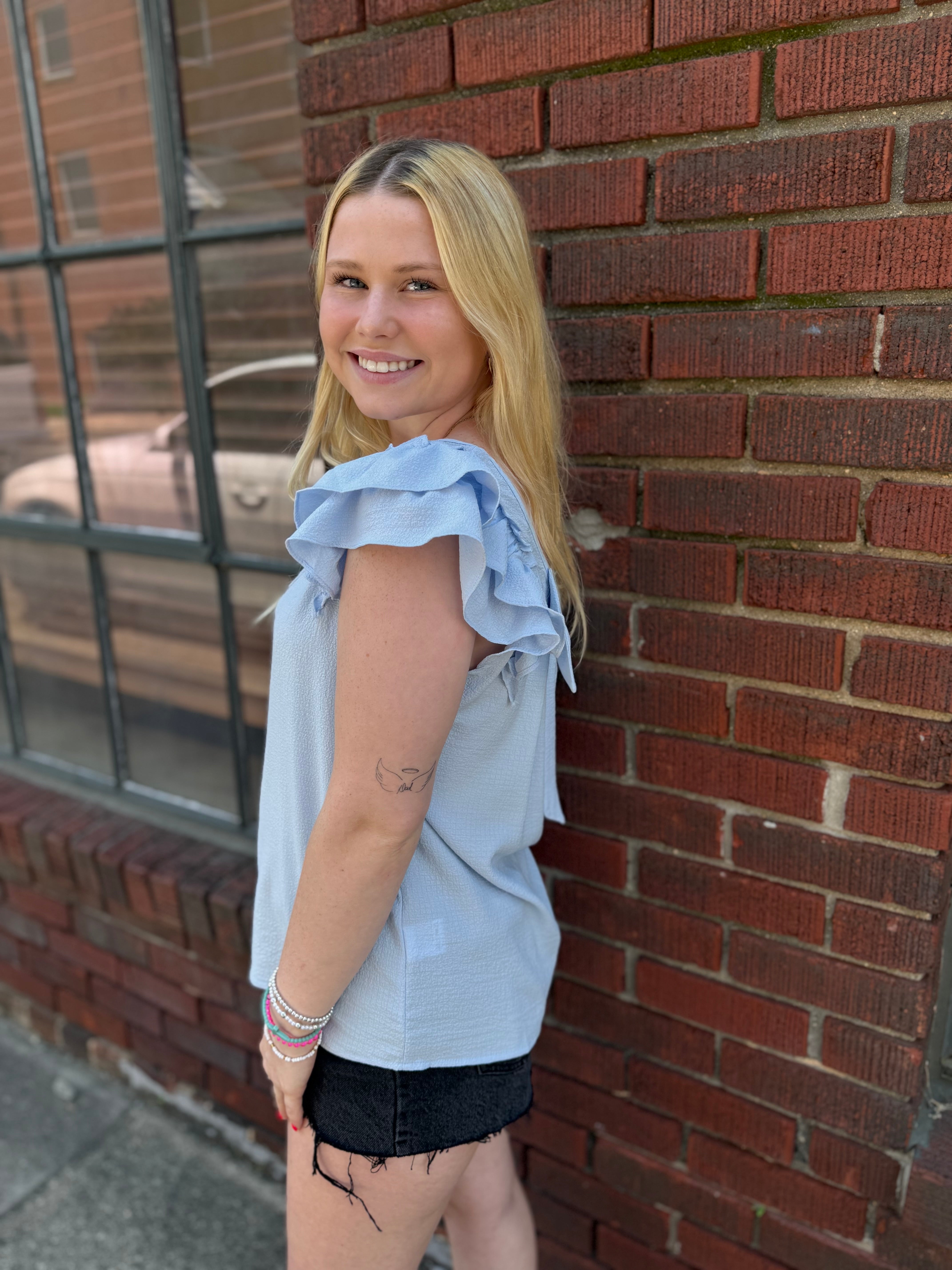 This tank top adds a touch of charm with its ruffle petal sleeves and bow detail in the back. Available in two colors, it's a must-have addition to any wardrobe. Perfect for layering or wearing alone, this top will be a versatile and stylish choice for any occasion.