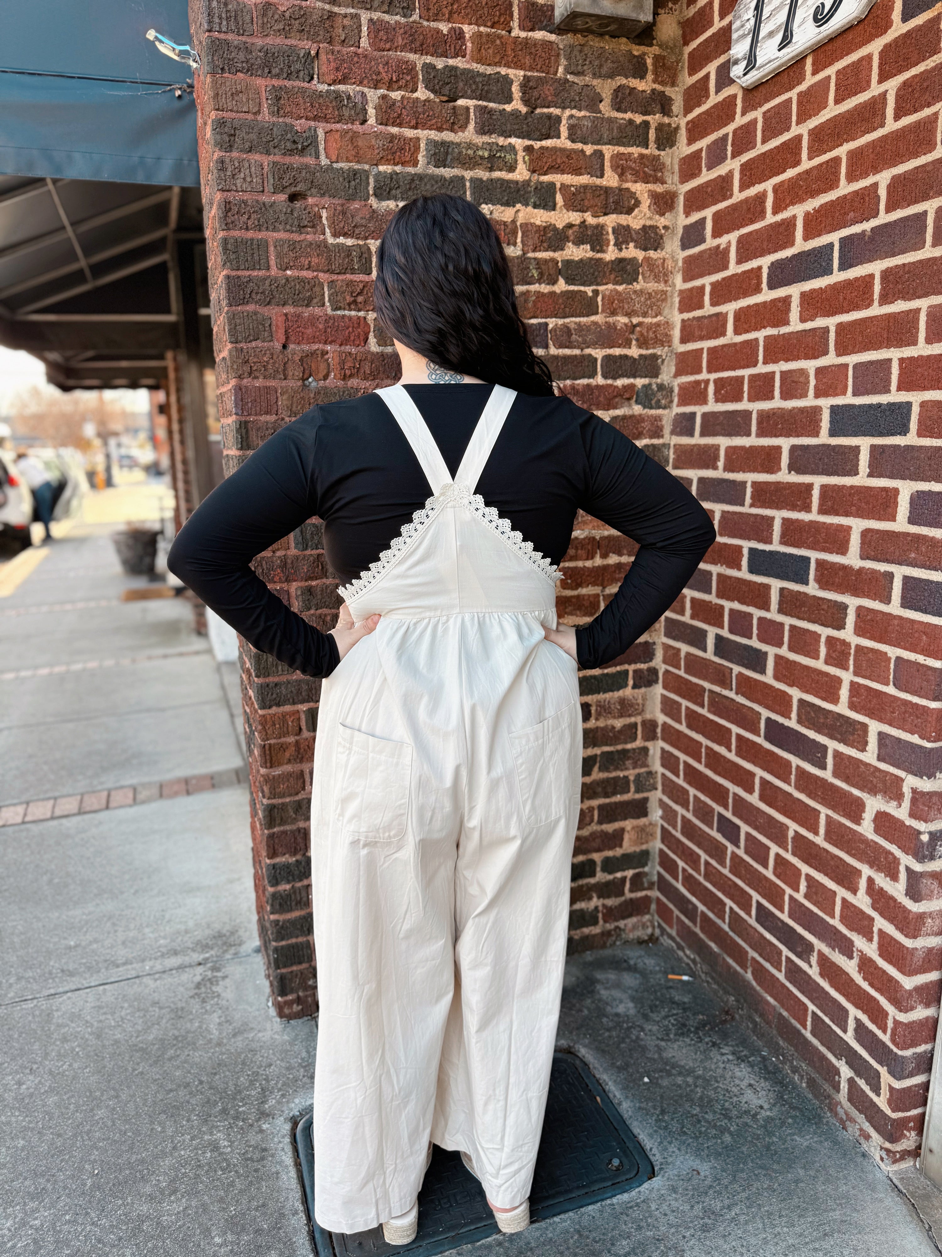 These lace-edge overalls in soft oatmeal redefine casual sophistication. The relaxed wide-leg silhouette flatters every figure while offering unrestricted movement, and the delicate lace trim along each hem adds an unexpected feminine detail that elevates this workwear staple into something truly special.